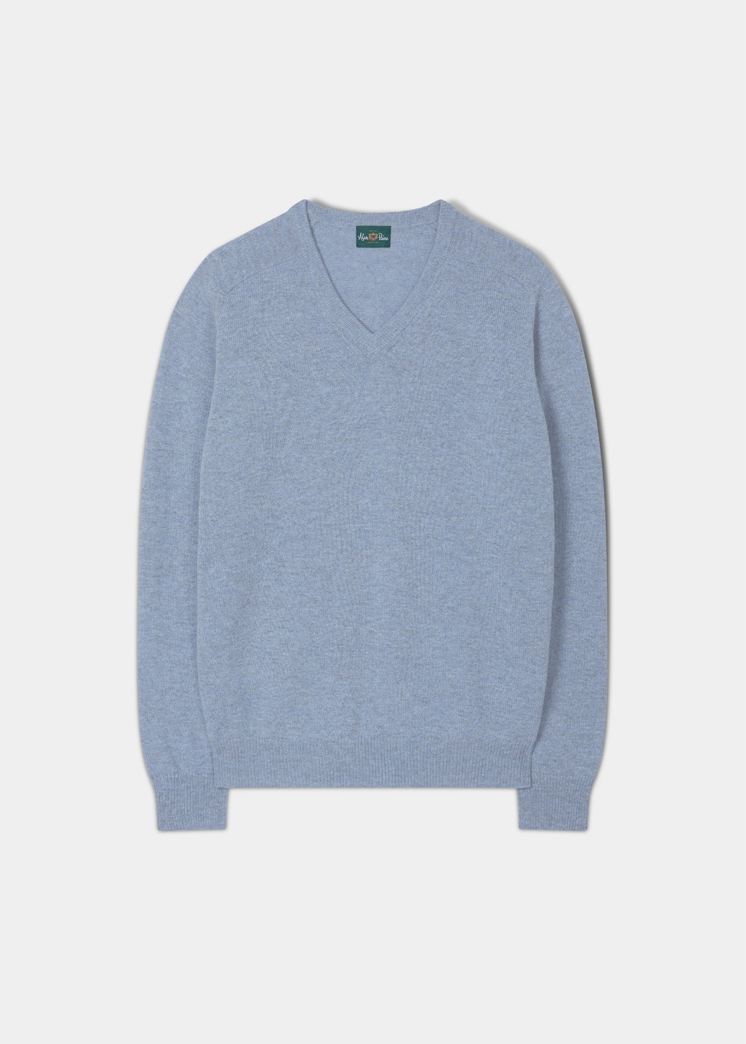 A true classic. This V-neck jumper in paradise blue is crafted from pure super-soft lambswool and spun by Europe’s oldest spinner, Z. Hinchliffe, founded in Yorkshire, England 250 years ago. It has a semi-saddle shoulder shaping, crafted to a modern contemporary regular fit, which is slightly tapered across the waist and chest, whilst still retaining plenty of room for comfort and ease of movement.